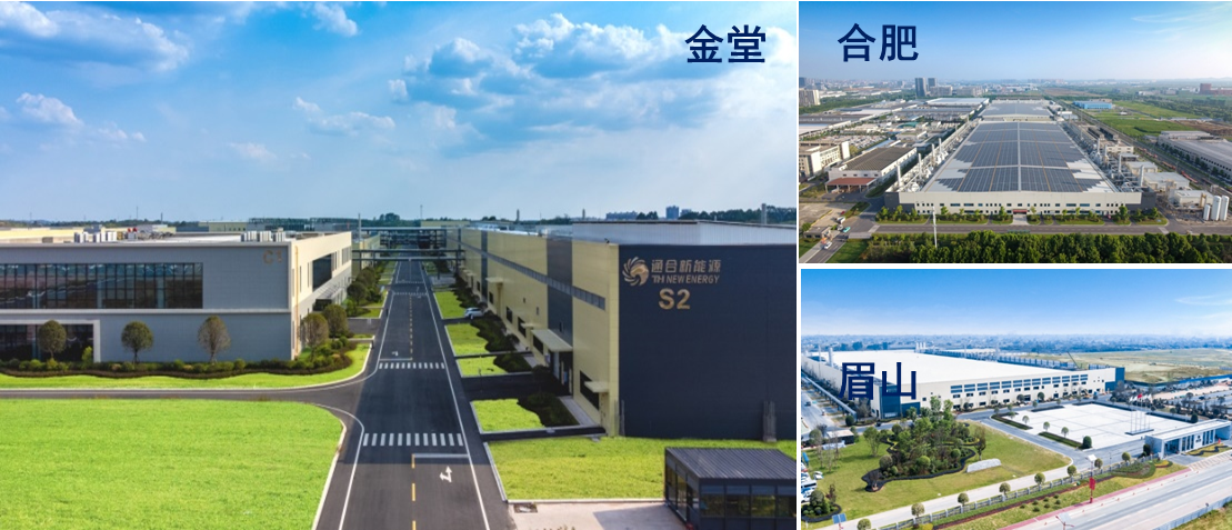 通威太阳能光伏产业基地项目总投资约200亿元,现拥有合肥、双流、眉山、金堂、彭山、盐城、南通七大基地及通合项目,电池现有产能超95GW,2024-2026年,将形成130-150GW的电池产能,其中大尺寸产能占比将超过90%,高效组件现有产能75GW。