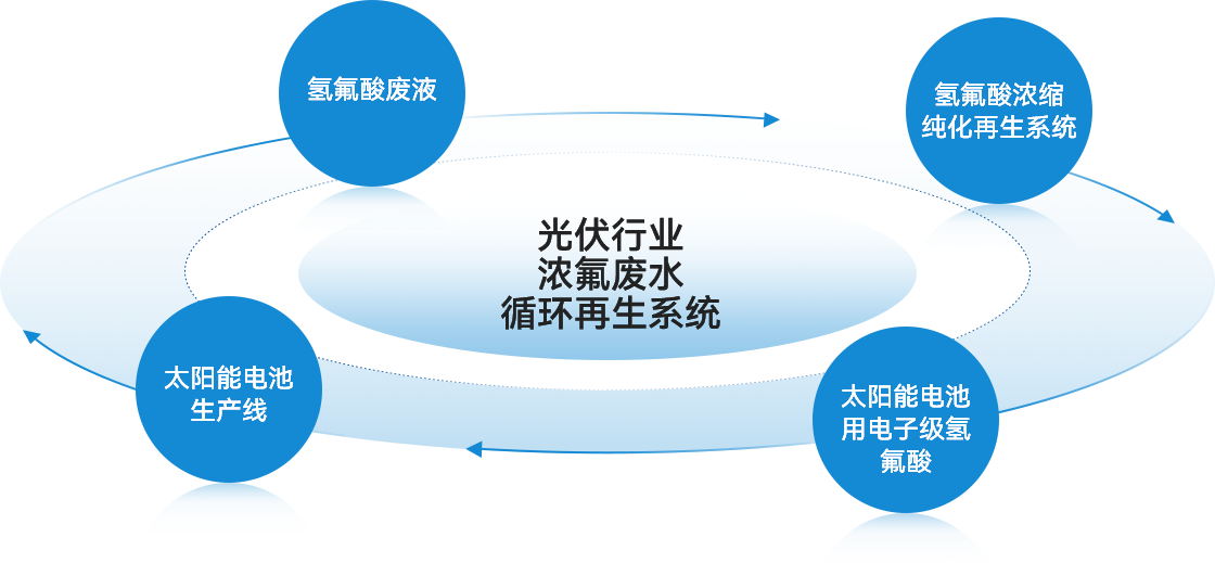 近年来,新能源行业发展突飞猛进,光伏电池片生产线逐年增加,伴随而来的便是大量待处理的废水,公司开发的浓氟废液回收电子级氢氟酸再生利用装置,针对光伏企业处理含氟废水的需求和难点,建立了全套解决方案。光伏电池生产排出的浓氟废液经过本系统处置后,一步到位达到太阳能电池生产用氢氟酸质量标准,直接回用于光伏电池生产各生产环节,可完全替代市售电子级氢氟酸,大幅减少含氟废水处置成本,同时减少含氟污泥排放总量。